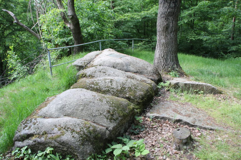 Die Erinnerungstafel wurde in einen der Rundlinge montiert. Diese Rundlinge wurden vom Inlandeis der Elster-Kaltzeit geformt.