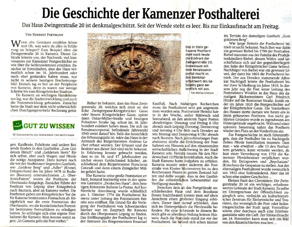 Norbert Portmann: Die Geschichte der Kamenzer Posthalterei. In: Sächsische Zeitung