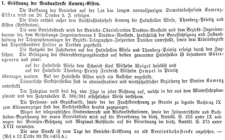 Am 20. Oktober 1890 konnte die Bahnstrecke von Kamenz nach Elstra eröffnet werden. Die Stadt wollte nun eine direkte Verbindung nach Dresden. Über Jahre hinweg wurden Petitionen gesammelt, die vor allem auf die wirtschaftlichen Vorteile einer Streckenführung von Kamenz nach Bautzen hinwiesen. Im Hinblick auf die in der Umgebung von Kamenz existierenden Steinbrüche ließ sich die Staatsregierung davon überzeugen, dass ein neues Projekt zur Ausführung gebracht werden musste. Anfang des Jahres 1890 wurde mit dem lediglich auf den Anschluss von Elstra an Kamenz reduzierten Streckenbau begonnen.