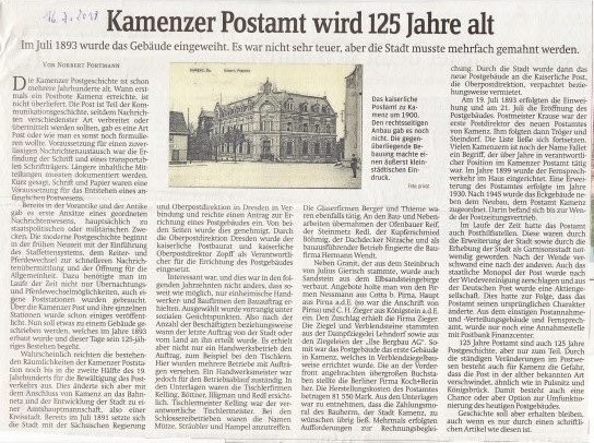 Norbert Portmann: Kamenzer Postamt wird 125 Jahre alt. In: Sächsische Zeitung vom 16. Juli 2018.