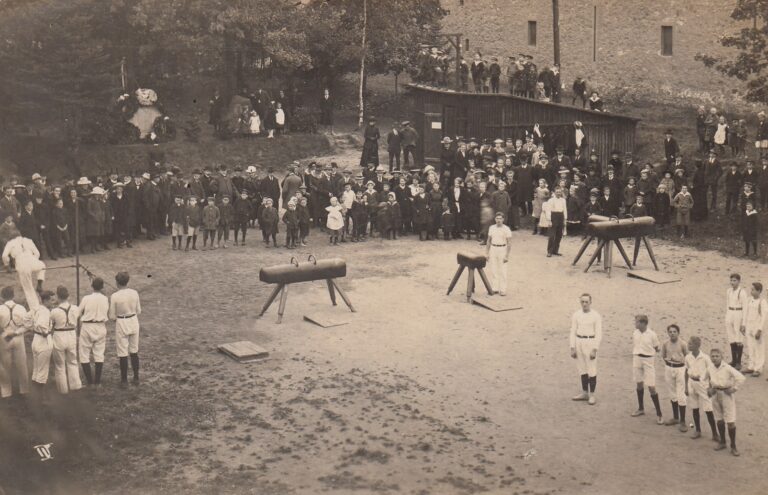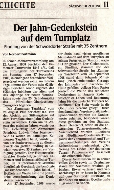 Im Hintergrund des Bildes befinden sich zwei Gedenksteine, der links ist für die gefallenen Kamenzer Turner und wurde 1920 aufgestellt. Rechts befindet sich der Jahn-Gedenkstein.